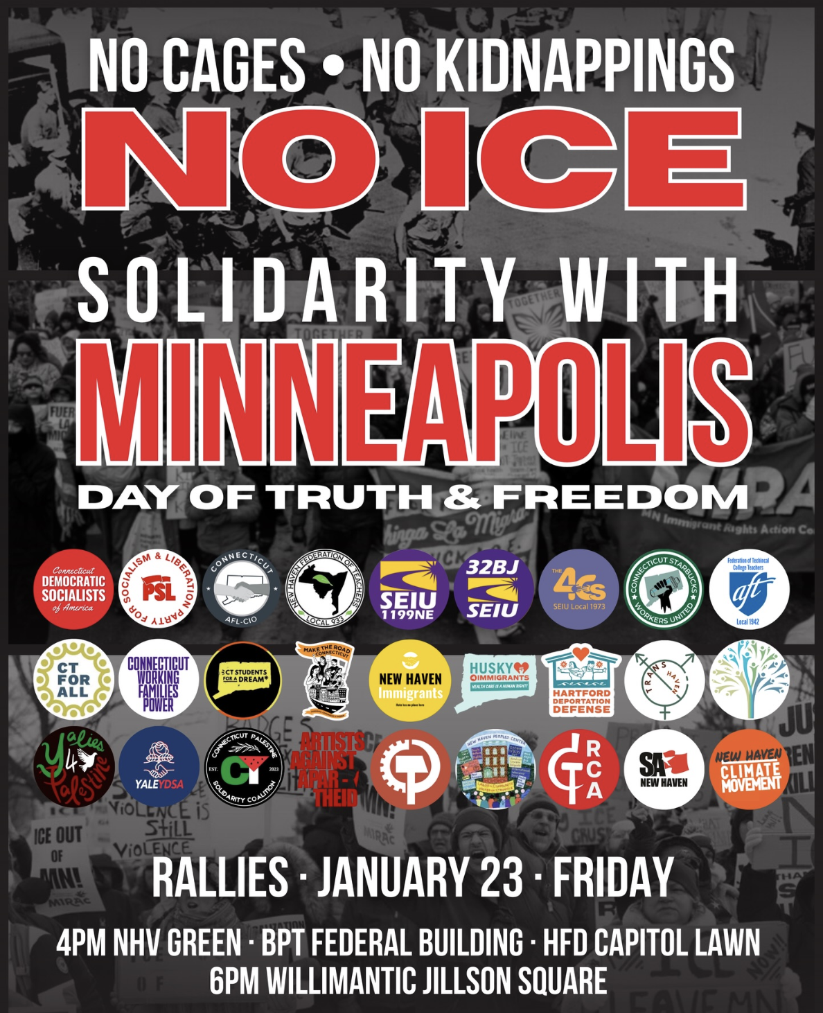 On Friday, January 23, 2026, UAW Region 9A, labor and other Connecticut community organizations are gathering for mass rallies and marches in solidarity with Minneapolis-St. Paul and their call for a national “Day of Truth and Freedom” as they face an expanding occupation and escalating ICE violence.