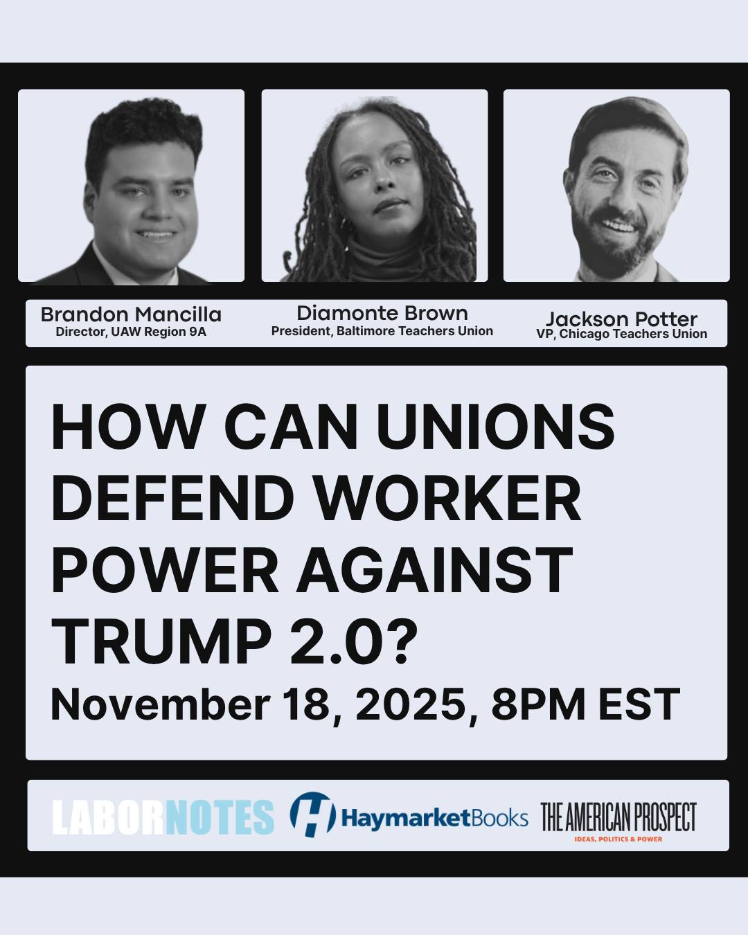 This authoritarian consolidation of power is testing unions. What can unions do to survive in the second Trump presidency? What tactics and strategies can help organize more new members and best survive an all-out assault on labor and other rights? Speakers include Diamonte Brown, President, Baltimore Teachers Union; Jackson Potter, VP, Chicago Teachers Union; and Brandon Mancilla, UAW Region 9A Director.