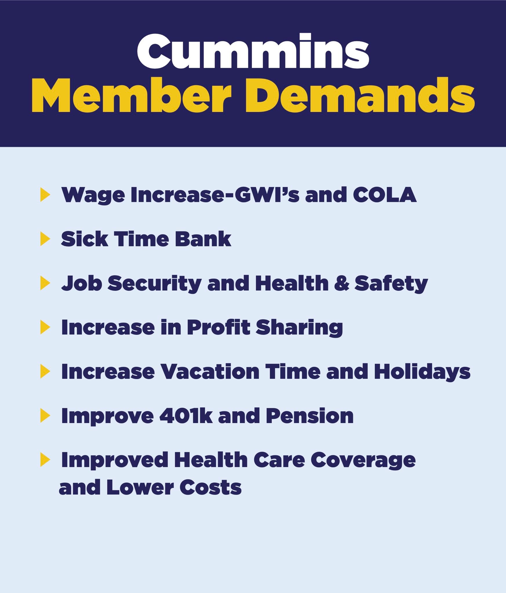 After 12 bargaining sessions with Cummins, we continue to push for our top priorities to get addressed—increased wages, sick time, job security, increased profit sharing, more vacation and holidays, and secure 401k and pensions.