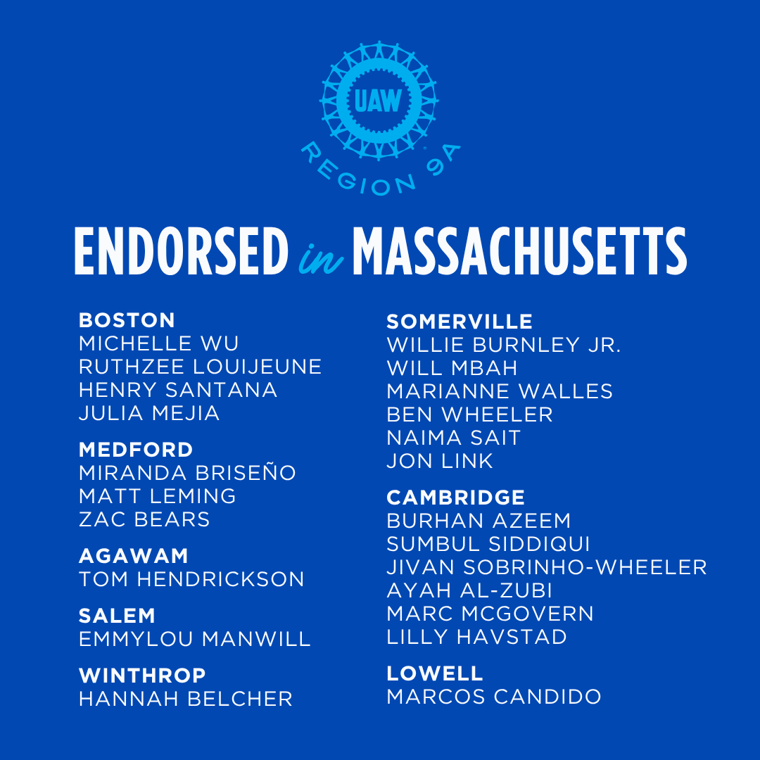 - Learn about our UAW-endorsed candidates for office in Boston, Somerville, Cambridge, Medford, Agawam, and Salem, and share with your coworkers.