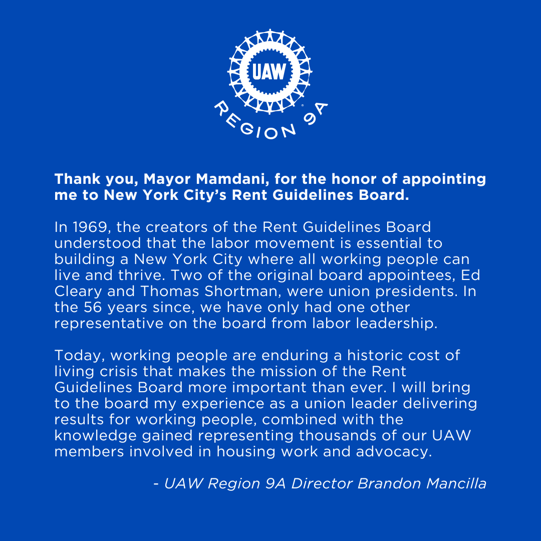 Today, New York City Mayor Zohran Mamdani announced he is naming United Auto Workers (UAW) Region 9A Director Brandon Mancilla to the New York City Rent Guidelines Board as a public member.
