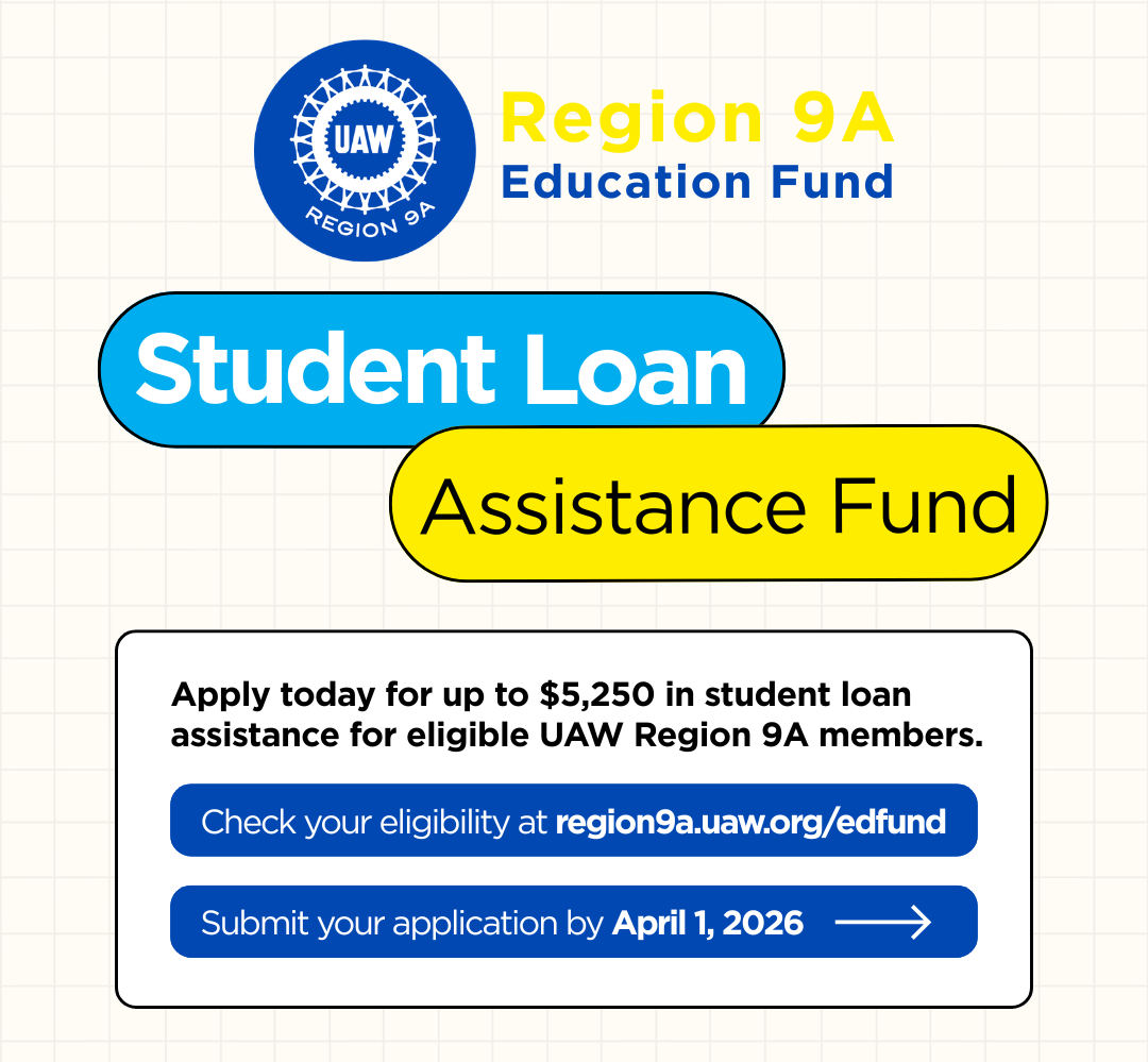 Applications are now open for the UAW Region 9A Education Fund's student loan assistance! Apply by April 1, 2026.